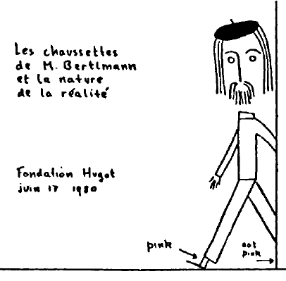 Dr. Bertlmann likes to wear socks of different colours. Which sock he will have on a given foot on a given day is quite unpredictable. But when you see that the first sock is pink you can be already sure that the second sock will not be pink. Observation of the first, and experience of Bertlmann gives immediate information about the second.
