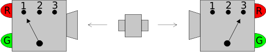 There are 2³ = 8 possible instruction sets: RRR, RRG, RGR, GRR, RGG, GRG, GGR, and GGG. If a particle arrives with, say, RGG then the apparatus flashes red if it is set to 1, and green if it is set to 2 or 3. To account for the strict correlation between the behaviors of the two apparatuses, the particles must carry opposite instruction sets: if one particle arrives with the instruction set RRG, the other particle arrives with GGR.
