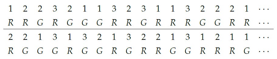 The pattern of R’s and G’s is completely random. This means, in particular, that the apparatuses flash different colors exactly half of the time.